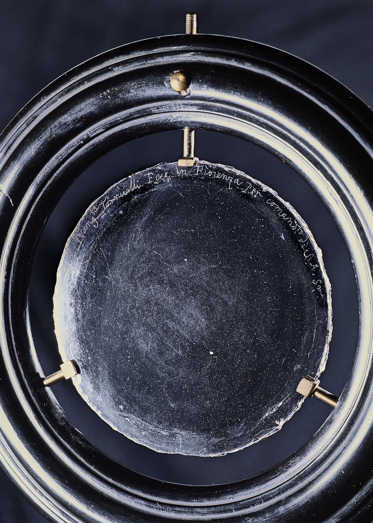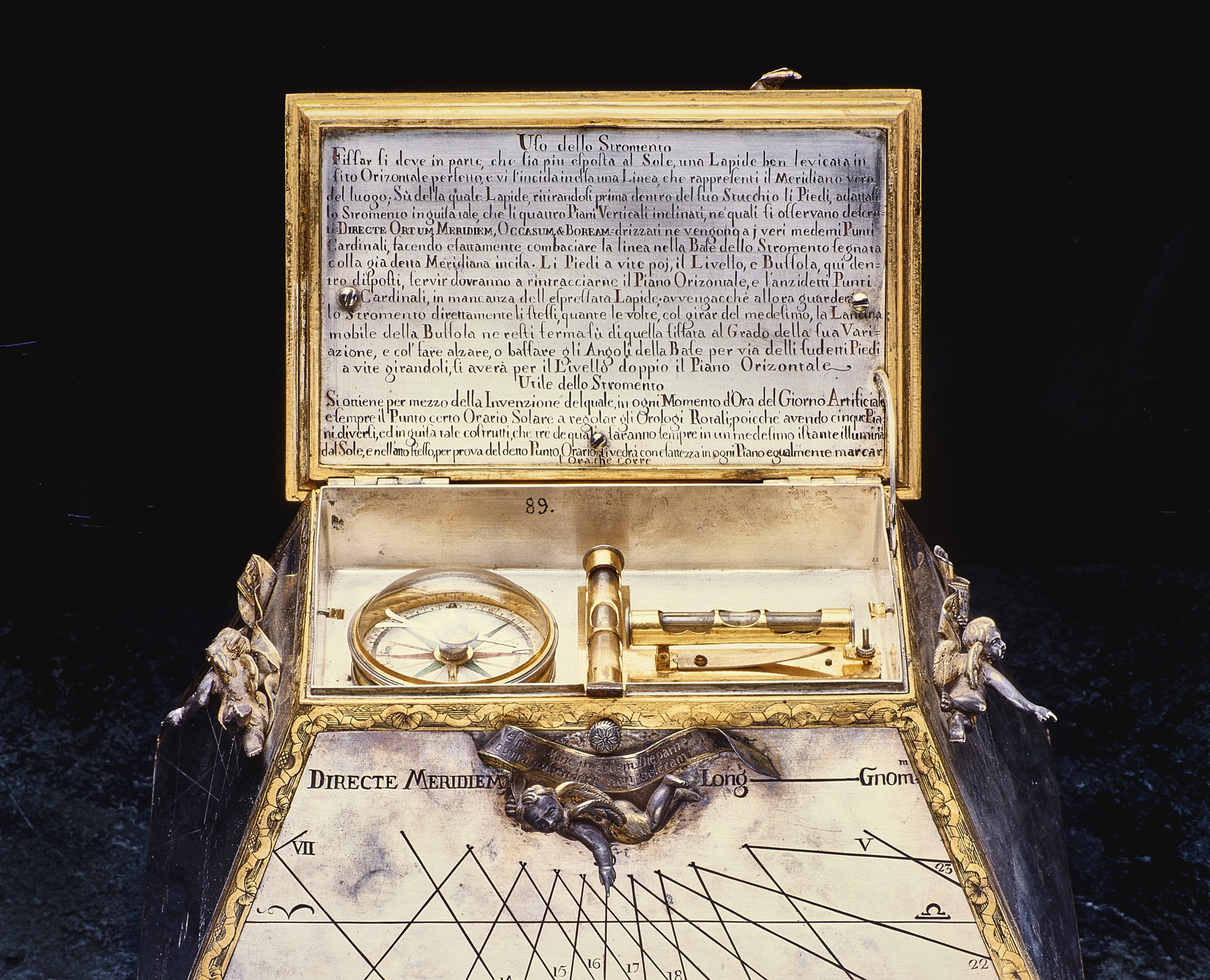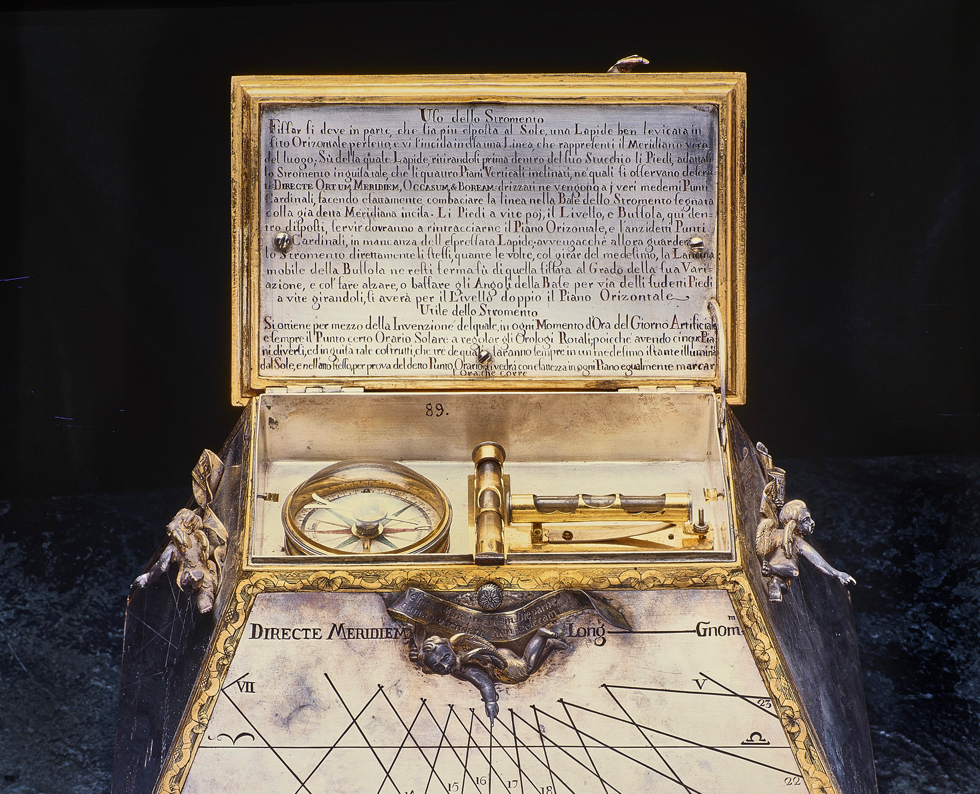 la lente obiettiva per cannocchiale (1645), firmata da Evangelista Torricelli, e la splendida meridiana a forma di tronco di piramide in oro e argento, con gnomone a forma di dito di putto.